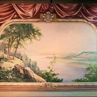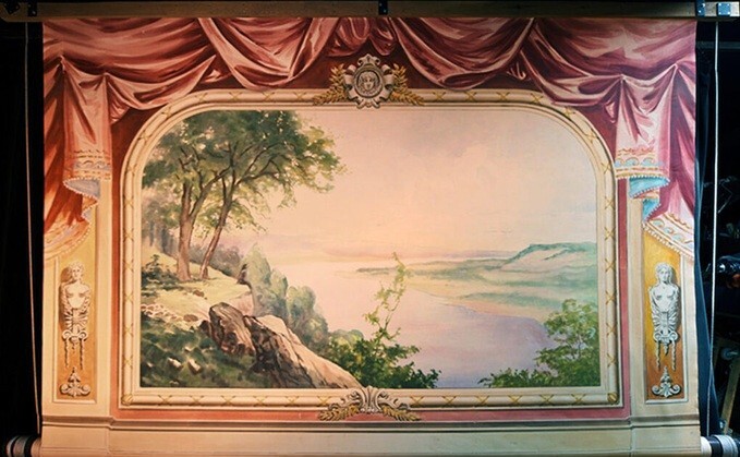 This olio curtain is a replica of one chosen by the Waterfront Museum from the collection of University Art Museum at the University of Minnesota, Minneapolis. We commissioned scenic painters to recreate the design for Showboats ‘Round the Bend, an exhibit produced in collaboration with the Theatre Museum.